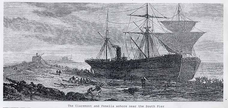 In all the history of wreck and disaster to which Shields is unhappily subjected, it has perhaps never had a night of such fatal and awful occurrences as was last nights witnessed. No pen can adequately describe the events which it is our painful duty to record. Those alone who were on the spot can fully realise the agony and solemnity of the scene. All yesterday a fierce gale from the south-east raged with unabated fury, rushing on the piers with angry mountains of sea, and lining the shore with one long belt of foam. The rain was continuous and blinding, and the grey dull sky overhanging the whole scene made the seaward prospect a very gloomy and depressing one. During the day a few vessels came into port, making the bar successfully; but the greatest anxiety was felt for several vessels that were known to have left London for Shields, and that would probably arrive last night. Towards midnight the wind abated slightly in violence, but the sea was running very high over the bar. All day yesterday, and through the night the most vigilant watch was kept at both the brigade houses, and at every place along the shore, that everything human foresight could devise was done to avert disaster. About two minutes to two o’clock in the morning the look-out man at the Brigade House on the South Pier reported a vessel. She was observed to be making very heavy weather, her masthead light going well down to one side. Suddenly she was seen to waver in her course; a heavy wash seemed to strike her bar, and instead of the red light, she showed green, plainly indicating that she had been turned completely round by force the waves. The men watching her notified that she did not recover so rapidly as might have been expected, and a few of them at once ran down the pier. The vessel by this time had got down to the south of the pier, and was coming on to the Herd Sand to the south; upon seeing this the brigade men signalled immediately to Tynemouth, and proceeded to get the rocket apparatus and gear down the pier. In the very act of doing so they were called by their mates on the pier, and rushing down with a promptness that cannot be too highly lauded got the van and the rocket apparatus right abreast of the vessel as soon as the first guns were fired from the battery and answered by the guns of the Castor. The whole section of the brigade in this emergency was admirable, as may be seen from the fact that before the last gun of the Castor had fired the first rocket was prepared to be shot. The first rocket line fell fairly amidships of the vessel, but hung on to the stays, where it could not be reached. A second line was fired which fell abaft the mainmast; but at last a line was secured and a hawser drawn on board. By this time, it became known that the vessel was the Claremont, of Newcastle, commanded by Captain Worth. She was from Hull and bound for the Tyne, in ballast. At three o’clock when communication had been effected, the pilots were then launching the Wm. Wouldhave lifeboat at the south side of the pier with the view of getting the crew off by that means. The brigade men were indefatigable in their endeavours, and the delay seemed to be on board, or owing to the terrific sea that was running. Shortly after three o’clock, the wife and child of the second engineer, Mr Harvey, were safely brought ashore by means of the apparatus; the poor woman and her little boy being much frightened. Then two by two the crew consisting of 20 hands, were all landed safely on the pier and taken to the Brigade House, where they were kindly treated. It appears that the Claremont left Hull about eight on Tuesday night, and when off the Flamborough Head she was overtaken by the gale, and ran before it until about noon yesterday, when off the Tyne, the tremendous gale making her labour. When the wind went down the master attempted to enter the Tyne, and when in the fair way for the harbour a succession of heavy seas struck her on the starboard bow and rendered her unmanageable. The helm was hard a port to clear the pier end, but as she would not answer, and was in great danger of striking the end of the pier, Captain Worth put the helm hard a starboard to run her on the beach, when she was seen by the brigade. The Claremont is 700 tons register, and belongs to Mr Wilson, Lovaine Place, Newcastle, the son of the owner being chief engineer. She is almost a new vessel, and is 5 years old, classed at Liverpool Lloyds. Her original crew is 24, but she had only 19 hands on board at the time of the wreck, besides the two passengers before stated. So happily ended the first calamity; but while all this was in progress the sea seemed to be increasing in violence, though the wind had somewhat died. Between 5 and 6 o’clock, a light was descried on the horizon to the far south. It was steadily watched as the other had been. And preparations for equal promptitude were made. The light approached and another screw-steamer was seen to be making for the harbour. All appeared well with her till, on rounding the pier a terrific sea caught her, and twisted her out of her course, and she struck with a tremendous crash upon the end of the pier. This proved to be the screw-steamer Tyne, Captain Lawlan, of North Shields. Once again the signal guns boomed out the startling, and in this case it proved fatal, tidings, for not a single soul of all her hands but perished in that awful sea. The vessel seemed to be very deep in the water, and appeared to be in a sinking condition. It was evident that she would soon go down. The most active attempts at rescue that ever mortal men could achieve were at once endeavoured, but nothing could avert such an appalling fatality. Rocket after rocket was fired, while the ship settled down before the very eyes of the brigadesmen who were striving with heart and soul to save the crew. The crew took to the rigging at once, and again and again the lines were fired to them. At this time the guns had brought a 
