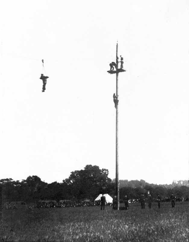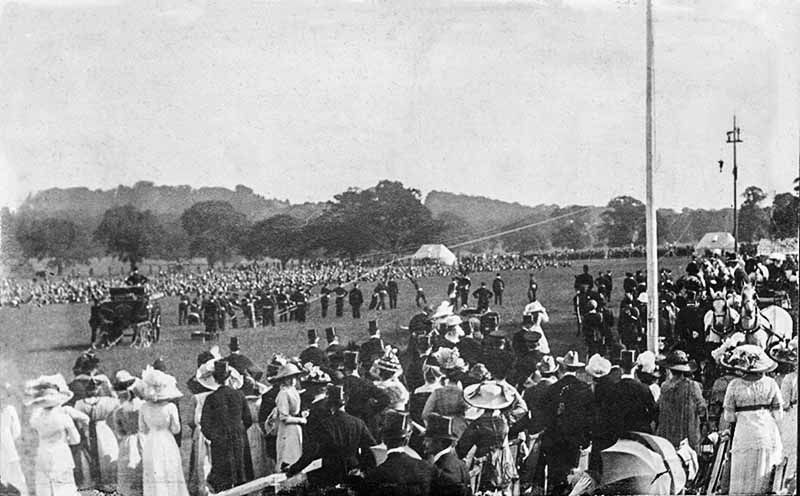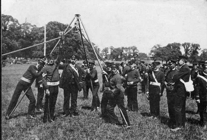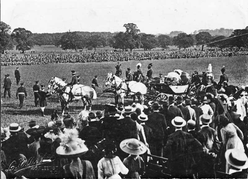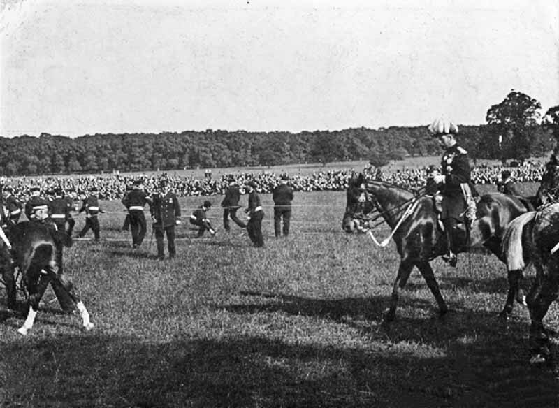A display of life-saving from a wreck by the Tynemouth and South Shields brigade was watched the King from the saluting base. His Majesty drew his horse close to the rocket apparatus. The Queen’s carriage was also taken close to the men at work. Three men were rescued from the “crow’s nest.’’ Though no rocket was actually fired, the basket was sent along the ropes, and each of the men was hauled to shore through imaginary waves. Detachments of the St. John Ambulance men rendered first aid and took them, on stretchers, to the rear. The Prince of Wales was noticed watching the rescues with the keenest interest.