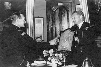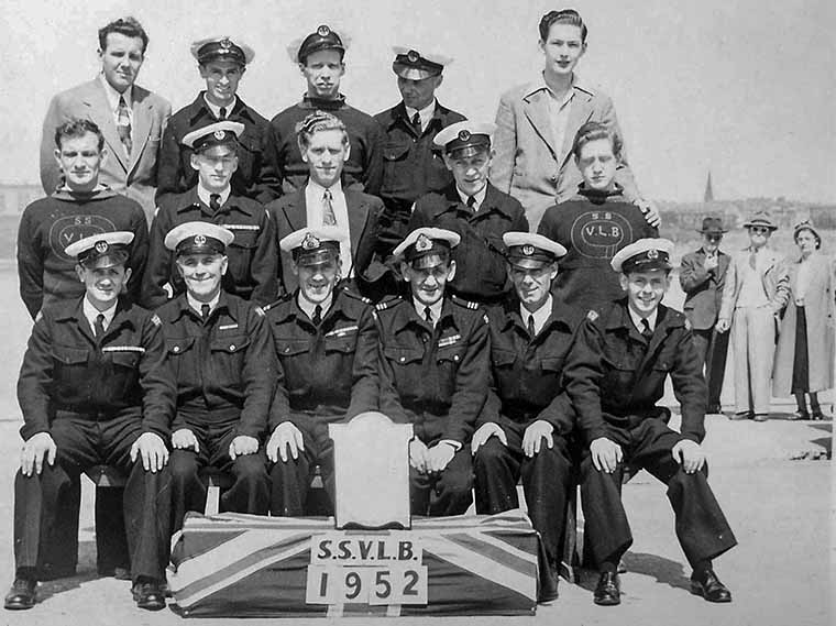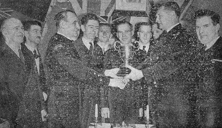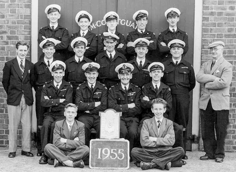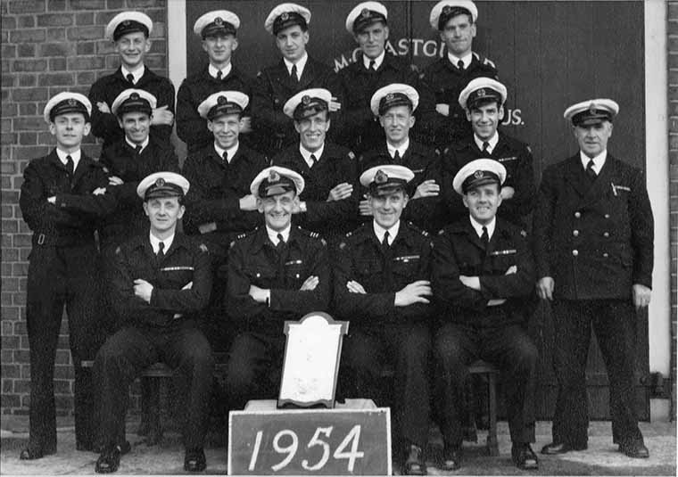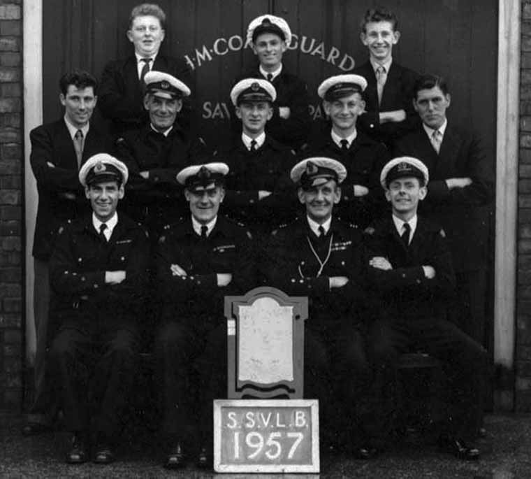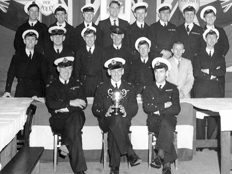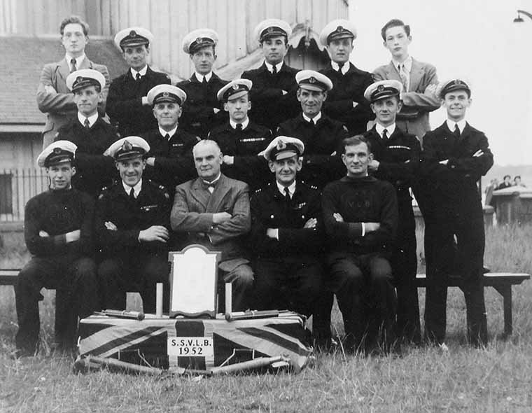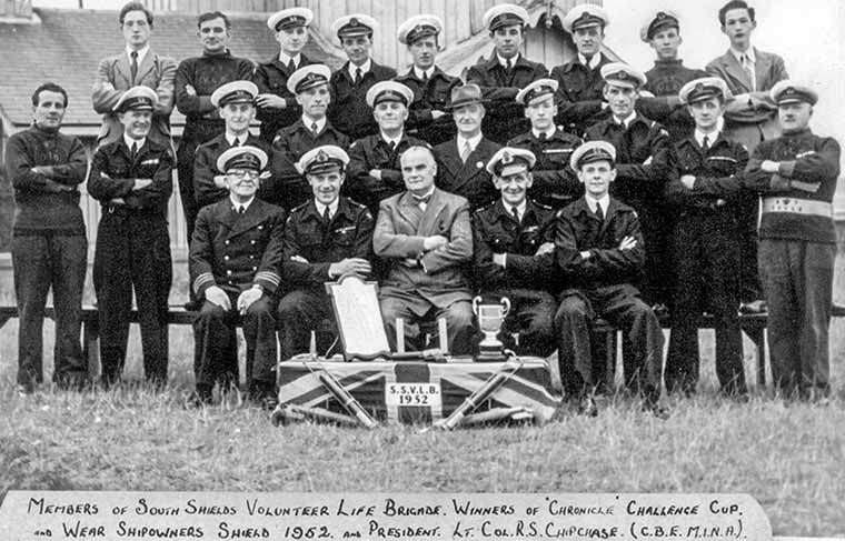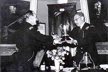 In 1952 the S.S.V.L.B. won both trophies. Captain G. O. Nickson, on the left, being presented with the trophies by Commander Kitkat, Coastguard District Controller for the North East, at Tynemouth V.L.B. Watch House.