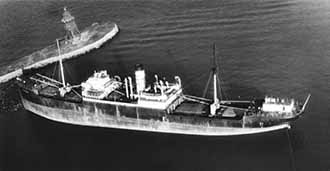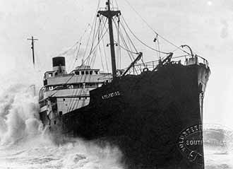 The Adelfotis II was being pounded by heavy seas and was moving towards the Groyne all the time. After some time it was noticed that the ship was blowing off steam, then at 8 - 45 am the first man was brought ashore very exhausted. As each man was brought ashore he was taken by ambulance to the Ingham Infirmary. After the ship was abandoned at 11.20 am, she was lying with a list to starboard her bows up against the rocks of the Groyne still with wind blowing very forcefully.