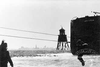 The Lebanese vessel "Adelfotis II" had sought shelter in the Tyne after being disabled, but the storms were such that she was driven aground near the south_ shore with waves pounding over her decks. The Brigade Secretary received a call at 04.05 hours and at 04.30 hours a team had assembled and the trailer was on the move. Shortly afterwards the Brigade was joined by Sunder-land Volunteer Life Brigade and lines were thrown from each Brigade, one across the bow and the other across the stern.