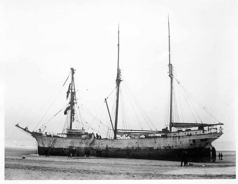 The sound of the alarm guns was followed by a rush to the seaside by thousands of the towns inhabitants, who trudged uncomplainingly through the slushy streets. With one accord, they swarmed over the sands towards the stranded vessel which lay snugly on the beach, with white water all round her, about 200 yards north of the Trow Rocks.
