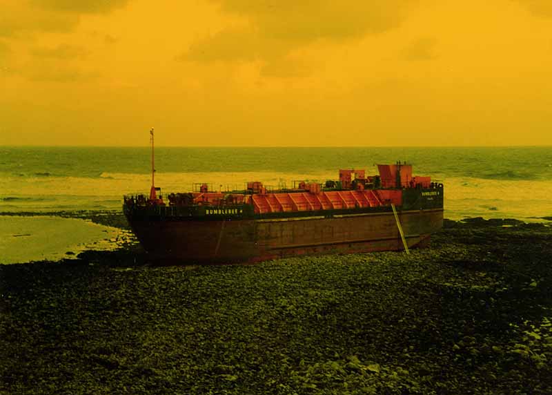 The colliery waste barge, Bumblebee 4 ran aground on Whitburn Steel during a gale on the evening of December 7, 1990. She had just left the Tyne, when she parted from the 149 gross tons pusher-tug, Weswear. Two crewmen had to be airlifted from the barge, which was refloated some days later.