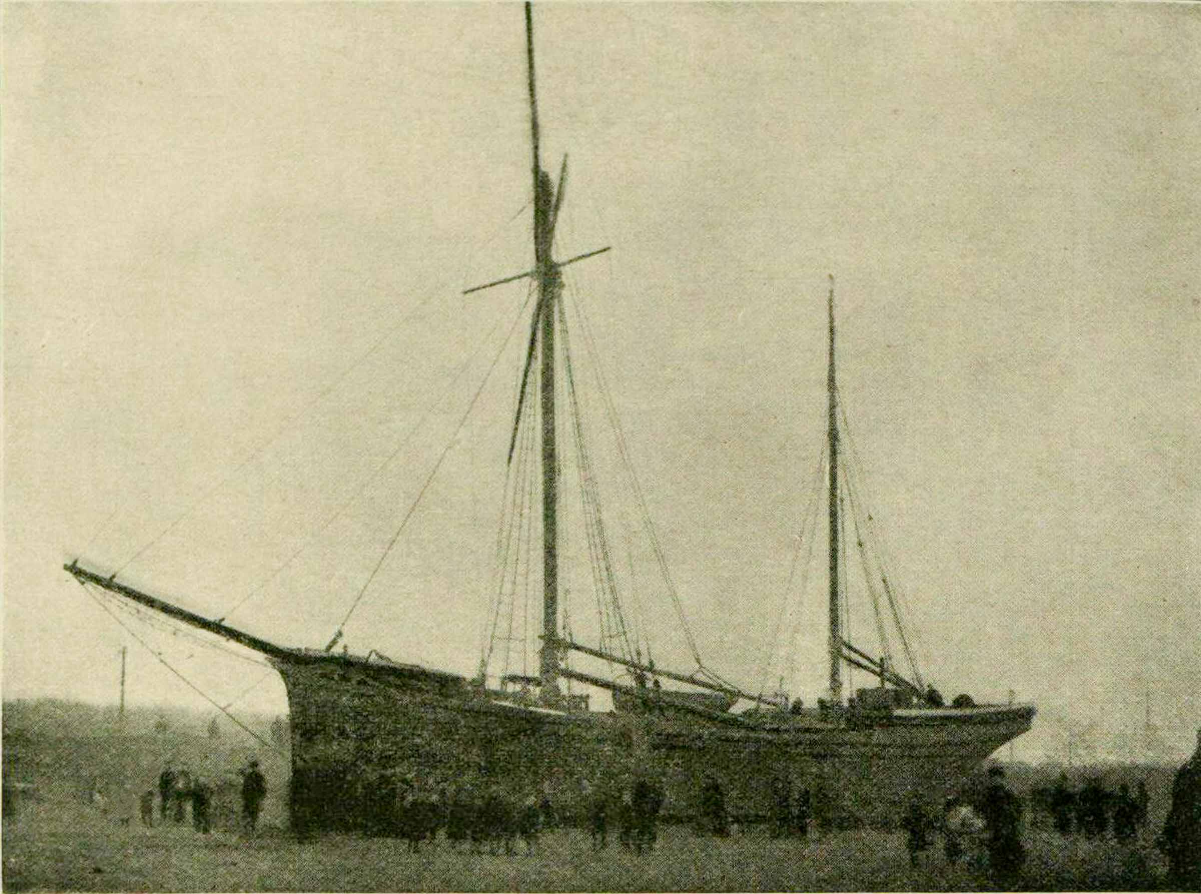 About nine o'clock renewed excitement was caused by the alarm signals being again fired. It was soon ascertained that the ketch Lord Dufferin, in making for the harbour, had run ashore not far from where the Constance Ellen had grounded, and her crew of five hands clamoured over the last named vessel and, dropping by means of lines to the sand, waded through the surf to the shore. The ketch was bound from Sandwich, Kent, to Seaham, light, under the command of Captain Coates. Owing to the very heavy weather it was impossible to enter Seaham and it was decided to keep off the land. On getting as far north as the Tyne an attempt was made to get into the harbour, but she could not be got far enough to windward. Her sails were blown to ribbons and she drove ashore. The brigadesmen went down to her, but their services were fortunately not required as the men had all got safely ashore.